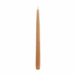 This 12 inch spice gold taper candle is hand dipped. It is dripless, clean burning and has a self fitting base!